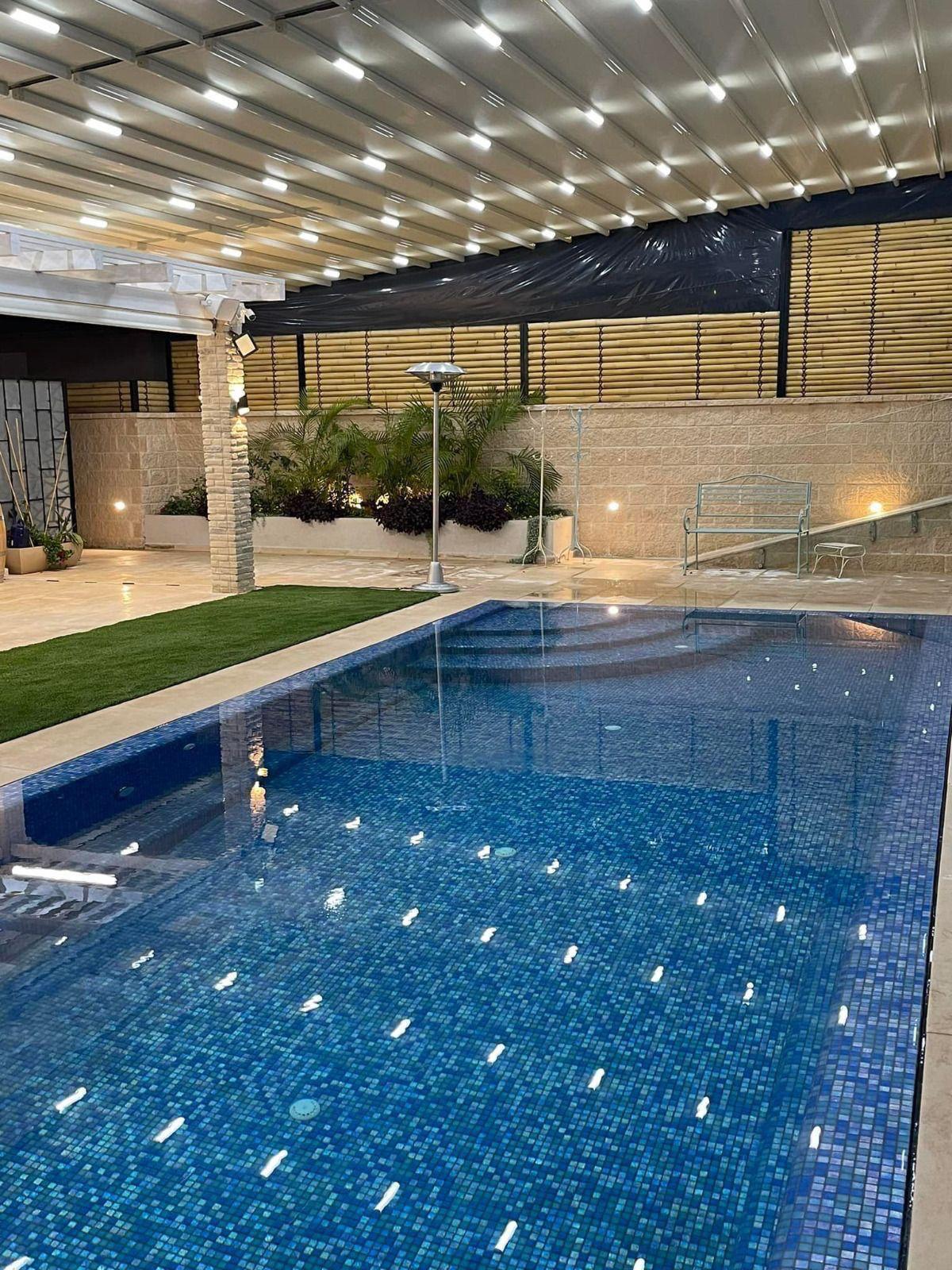 • בריכה בנויה מחוממת – 34-33 מעלות קבוע. בריכת גלישה בנויה. גודל: אורך 10 מטר, רוחב 3.5 מטר. עומק מתחיל 1.1 מטר ועד 1.7 מטר.
